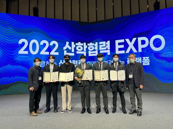 순천제일대 에이플러스팀이 2일 수원 컨벤션센터에서 열린 2022 산학협력 학술 엑스포에서 LINC 3.0 캡스톤디자인 경진대회 부문 교육부장관상을 수상했다. 이충기 학생이 LINC 3.0 산학연계 교육과정 영상콘텐츠 공모전 부문 LINC 3.0 사업단협의회장상을 들어보이고 있다. 사진=순천제일대 제공